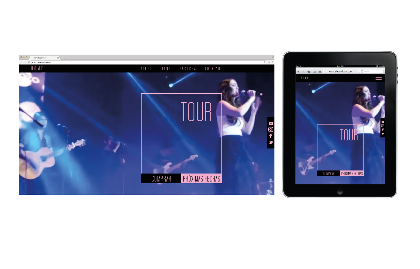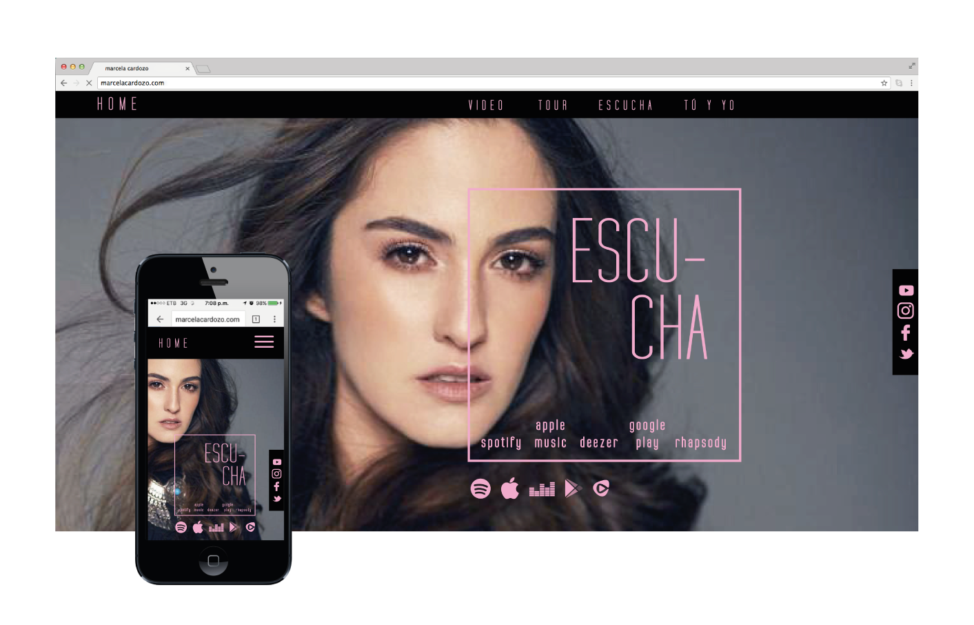Este proyecto de diseño web se desarrolló para una cantante caleña, partiendo de la intención de equilibrar romanticismo y divergencia. El proceso creativo buscó una composición delicada y de líneas limpias que pudiera dialogar con públicos diversos. La paleta cromática, construida entre el negro y el rosado, articula fortaleza y sensibilidad, mientras una tipografía estructurada aporta un carácter contemporáneo que refleja rigor, método y una mirada proyectada hacia el futuro.